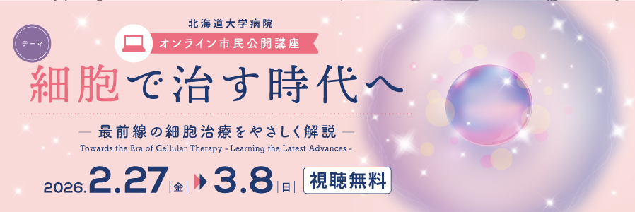 北海道大学病院は臨床研究中核病院※として患者・国民の皆さまの臨床研究・治験や医療・ヘルスケアに関する理解の向上を目指して、市民公開講座を開催しています。 ※臨床研究中核病院:日本発の革新的な医薬品や医療機器の開発に必要となる質の高い臨床研究や治験を推進するための中心的役割を担う病院として医療法上に位置づけられたもので、当院は平成30年9月に認定されました。 https://www.mhlw...